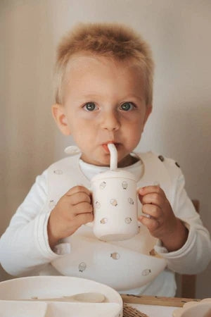 Il bavaglino e la tazza in silicone Bamboom uniscono funzionalità, comfort e stile, rendendo ogni pasto un momento di gioia e stile
