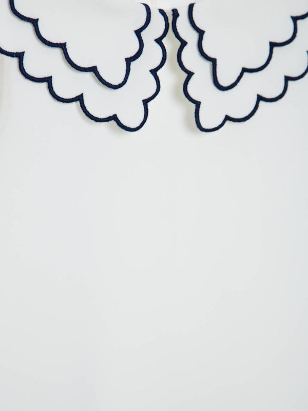Questo grazioso abito bianco di Patachou è un capo affascinante ed elegante. Realizzato in tessuto crepe fluido, presenta finiture abbinate nella parte inferiore della gonna plissettata, aggiungendo un tocco di giocosa raffinatezza.