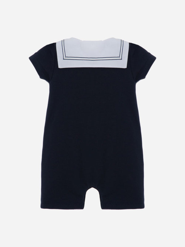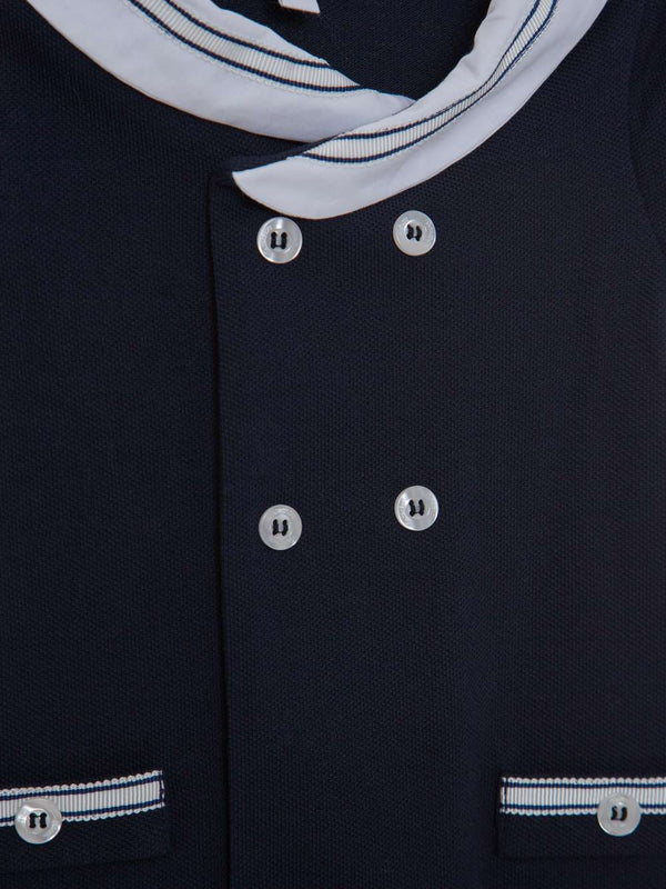 Questa elegante tutina blu marino di Patachou è un capo affascinante e ispirato alla nautica. Realizzata in un mix di jersey piquet e popeline, presenta un classico colletto bianco e un'apertura doppiopetto, completando il look da marinaio.