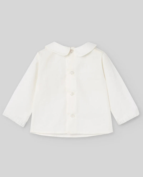 Camicia da bambino in tessuto strutturato con ricamo centrale, abbinata alla collezione SEMILLA. Manica lunga, colletto bebè e chiusura posteriore con bottoni.