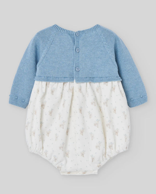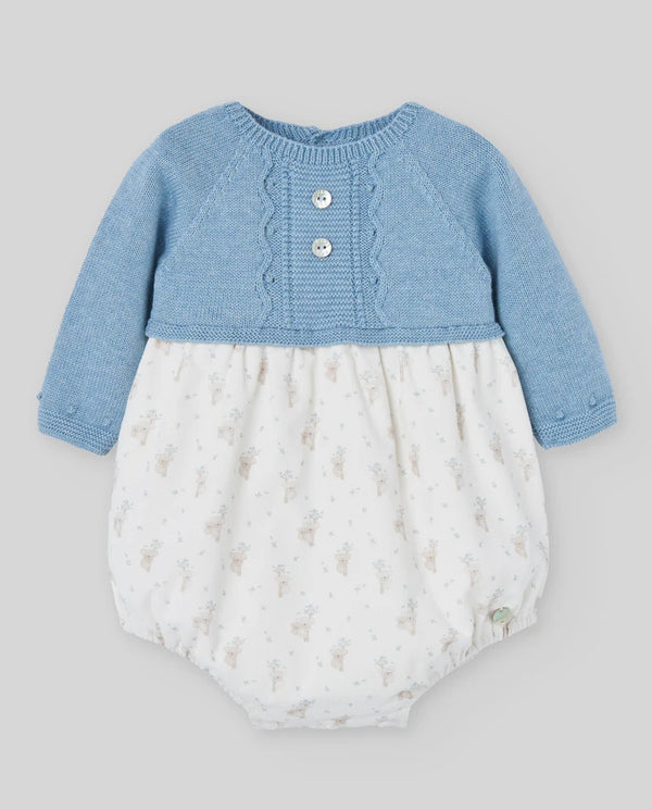 Tutina in maglia e tessuto misto cotone-cashmere. Colletto decorativo e pettorina arricciata. Chiusura a pressione dietro e sul cavallo.