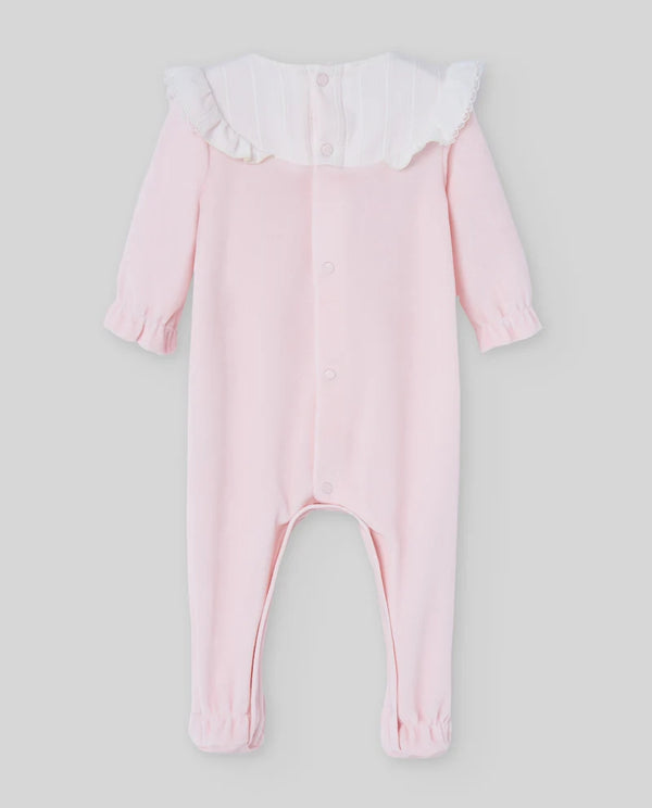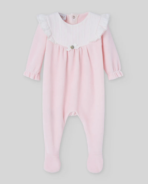 Tutina in velluto con volant, perfetta per bambina. Colletto rotondo e chiusura sul retro.