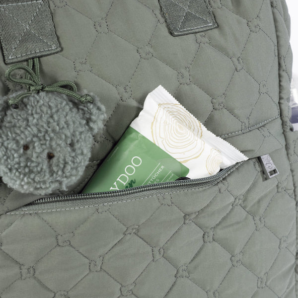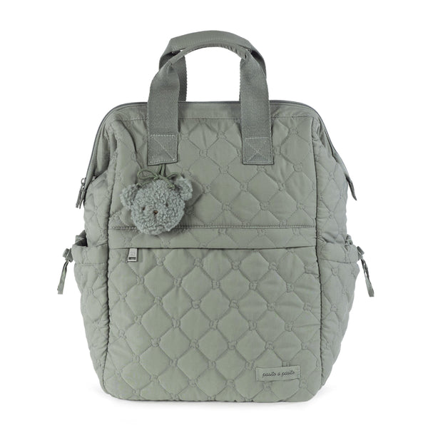 Lo zaino verde Paddington di Pasito a Pasito è realizzato in resistente materiale trapuntato. Ampio e funzionale, questo zaino ti permette di portare tutto ciò di cui tu e il tuo bambino avete bisogno. È dotato di pratiche tasche interne ed esterne per mantenere ogni oggetto a portata di mano e perfettamente organizzato. Tra le caratteristiche principali, include una tasca termica interna per biberon, una tasca impermeabile per gli indumenti bagnati e due tasche laterali pensate appositamente per i biberon.